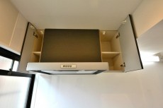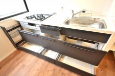 キッチンの収納も大容量◎キッチン下部の収納は引出しタイプの3段構成なので、とてもしまいやすく出しやすく、ラクラク収納できます。またレンジフードの両脇にも吊り棚が付いています。