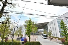 階段を登って2階に上がると、玄関の前から日体大を見る事ができます。日体大の校門からもバスが出ているようですが、さすがにこれに乗ってはいけない、と思います笑