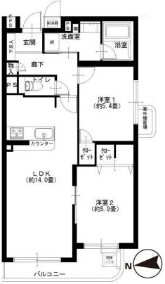 58.5㎡の2LDK角部屋、西向きのお部屋です。