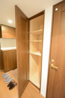 入って右には上下にわかれてシューズボックスがあります。