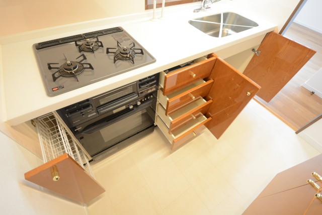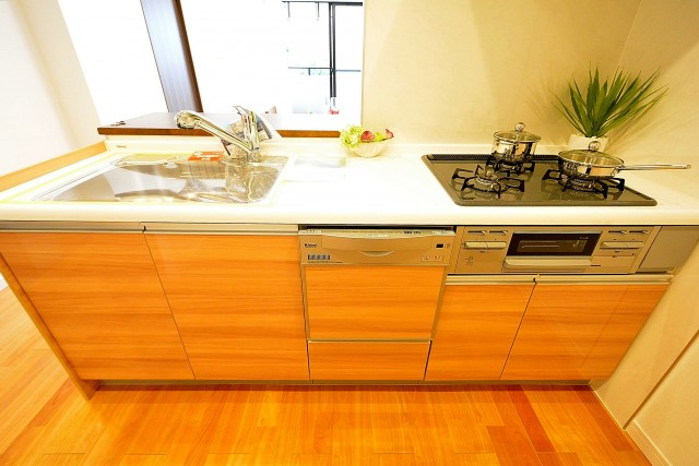 キッチン設備は3口ガスコンロ、グリルや浄水器一体型水栓、食洗機も付いていて充実しています。
