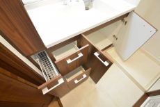 洗面台の正面のスペースが広くなっているので、棚なども置けそうなスペースがあります。