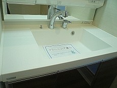 ワイドにたっぷりとあるノーリツ製洗面化粧台です。スタイリッシュな洗面ボウル両サイドには物を置けるスペースがあります。アクセントに緑を飾ったりなんていかがでしょう~