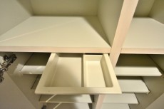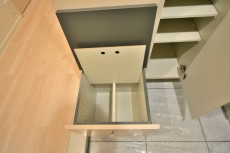 シューズボックスにはちょっとした仕掛けがあります。左側の棚には、鍵や小物を収納しておける引出しや、内蓋が付いている引出し(何を入れておくスペースでしょうか?私は長靴やブーツを入れるのかな、と思いました。)も付いています。