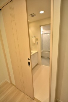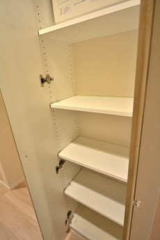また、洗面台の隣にはリネン庫が付いています。洗面用品だけでなく、バスタオルのストックやお掃除道具などもいっぺんに収納できるので、室内をスッキリ見せる事ができますね(^_-)-☆