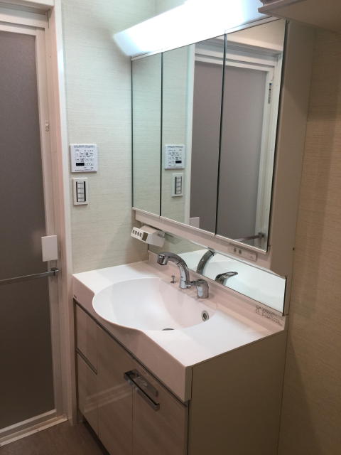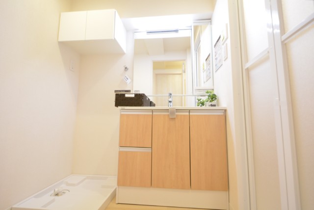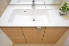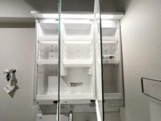 洗面化粧台は身だしなみを整えるのに便利な三面鏡付き。裏がキャビネットになっているので、洗面周りの細々したものもスッキリと片付けることが出来ますよ。