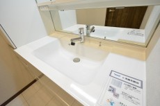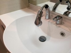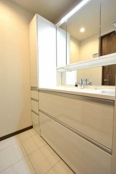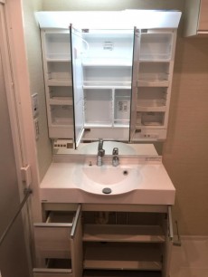 幅がありボウルの大きな洗面台はシャンプードレッサータイプで三面鏡裏収納など機能的。