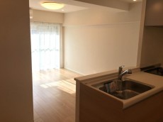 約15.0帖のLDK。南向きのバルコニーに面したお部屋です。シンプルな色使いながら、さりげない木の質感が心地よい感じですね。