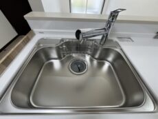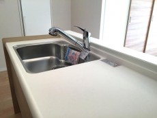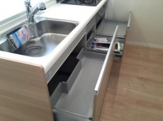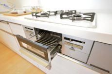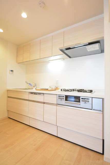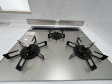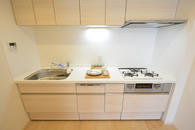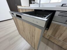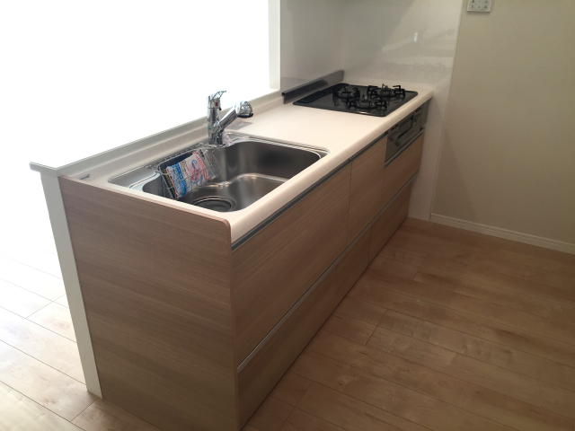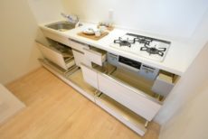 設備は3口ガスコンロ、グリルに浄水器一体型水栓と食洗機も付いて充実しています。