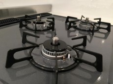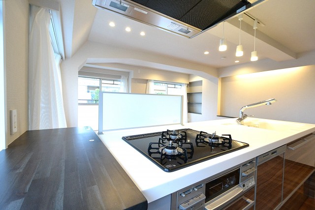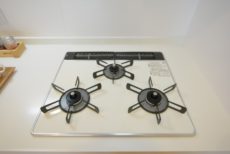 3つ口コンロはお料理好きの方には嬉しいですね♪大きなワークトップは人造大理石。こまめにお掃除をすれば高級感がいつまでも失われず、家事へのモチベーションもグンとUP☆