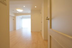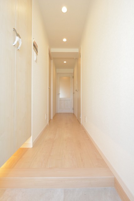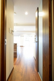 玄関を入ると正面ドアまで長い廊下が伸びています。幅も十分で80㎡超の余裕を感じますね。白を基調に明るめの建具を使った、ナチュラルな雰囲気です。