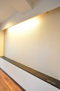 壁際には可動棚とテレビ台にも重宝しそうなカウンターがあります。