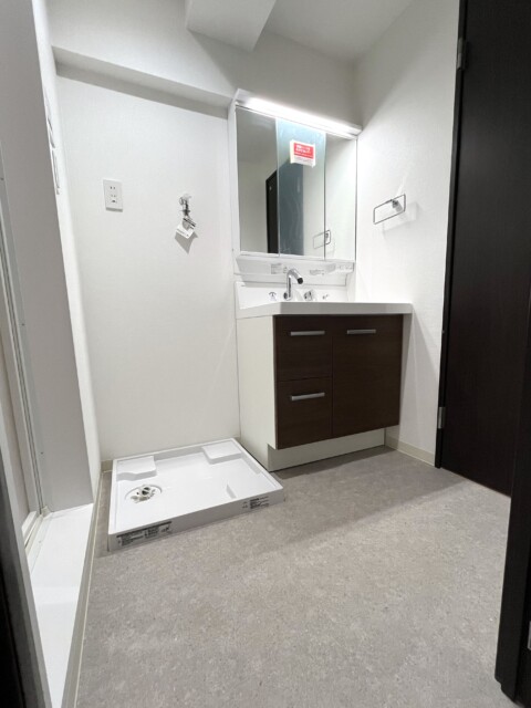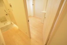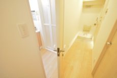 左手にバスルーム、正面に洗面台・洗濯機置場、右手にトイレの並びになっています。