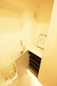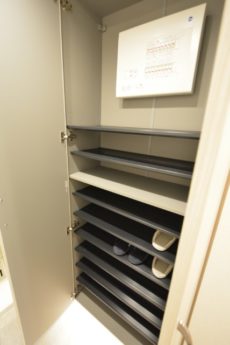 玄関右手には、光沢がある白のシューズボックスがあります。棚は便利な可動式なので、大きな靴の収納も楽々できます♪