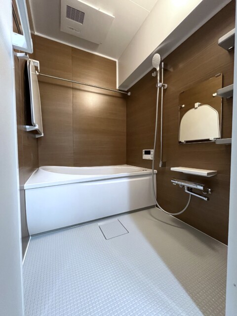 浴室は木目パネルに囲まれた落ち着いた雰囲気。ゆったりと湯舟に浸かれば一日の疲れも洗い流せそうですね♬ 追い焚き機能や浴室換気乾燥機も付いています。