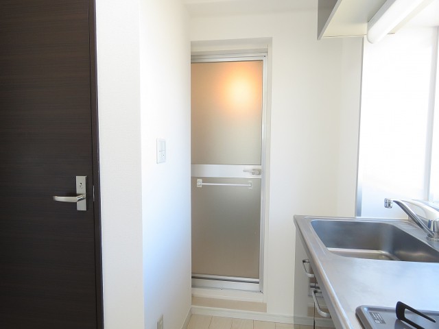 写真の右側の窪んだところが洗面化粧台、左側の扉がトイレです。