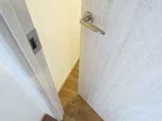 玄関をあがると目の前は廊下。洗面室、トイレ、リビングダイニングへの扉が廊下を囲むように並んでいます。さっそく水廻りから順番にご紹介いたします。