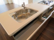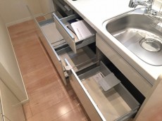 対面式ですので上部の収納はありませんが、シンク下の収納は、スライド式なのでキッチングッズの収納も楽々 (●´∀`)配管を気にせず収納できるので大容量。