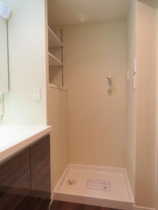 廊下へ戻って、玄関近くには洗濯機スペース。棚も付いているので、洗剤や洗濯ネットなどの洗濯グッズをすぐ手の届く所に置いておくことが出来ますよ。
