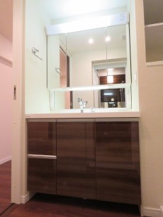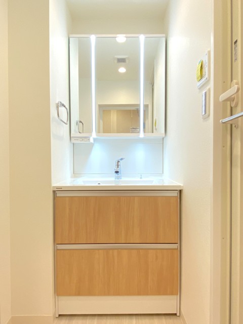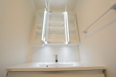 洗面台は三面鏡付き。鏡の間に付いた照明のおかげで鏡を使う時に影になることもありません。