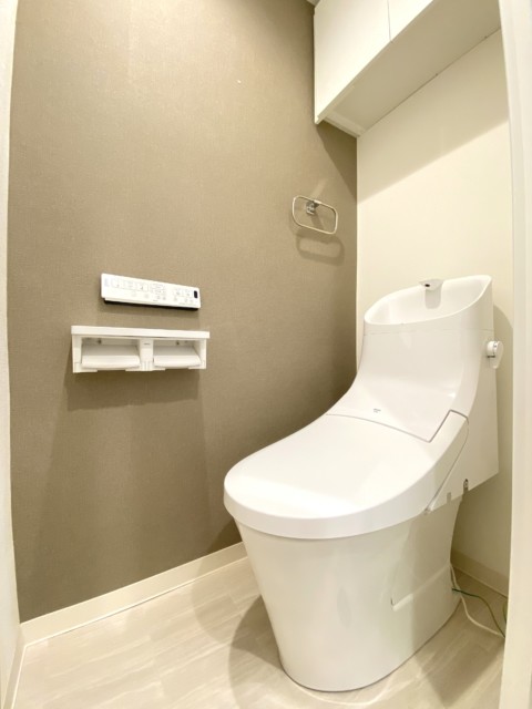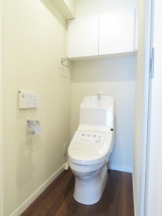 トイレはウォシュレット付き。こちらも洗面室と同じくフローリングです。上の吊戸棚にペーパーのストックや掃除用具を仕舞っておけば足元もスッキリ。