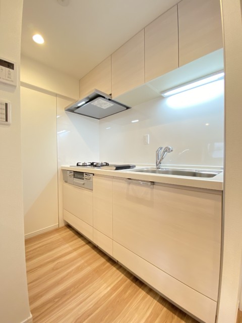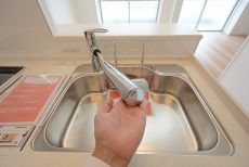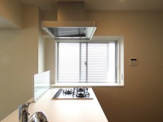 キッチンは浄水機能付き水栓、3口コンロ、人造大理石トップとスペックも◎。横に窓があり自然換気もバッチリできます。