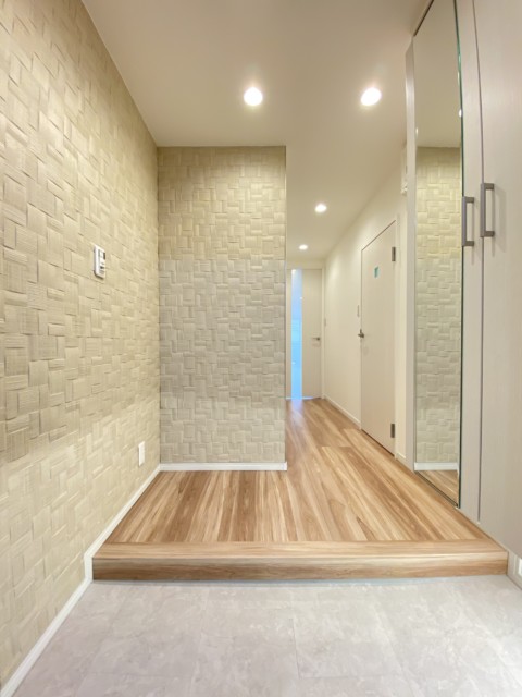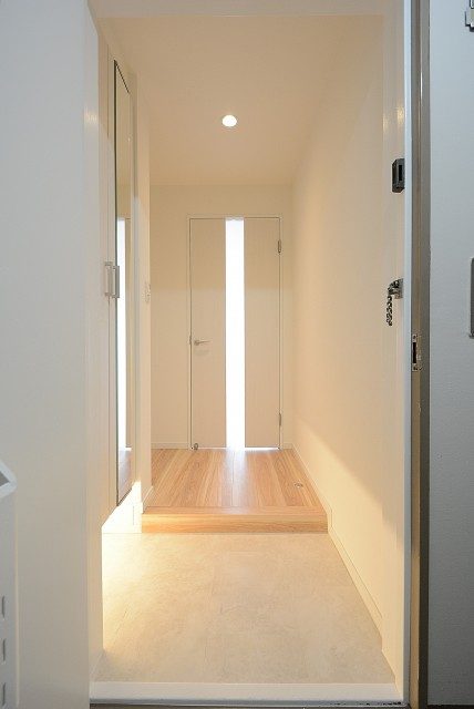 玄関を開けると、生まれ変わったばかりのキレイなお部屋が出迎えてくれました☆玄関照明は人感センサーになっているので節電はもちろん夜間のお帰りの際も便利です。