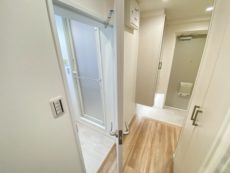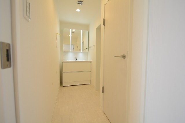 廊下右手には、スライドドアのサニタリールーム。水回りが集まっていてお掃除楽ちん。段差も無くて移動もスムーズです。右手にバスルーム、正面に洗面台、左手にトイレの配置になっています。