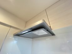 調理中は換気扇をお忘れなく。少し早めに回し始めると効果的らしいですよ。水栓は浄水機能付きシャワー水栓。切替えるだけで気軽に美味しいお水を使う事が出来ます。ノズルが伸びてシンクを流すのにも便利ですよ。