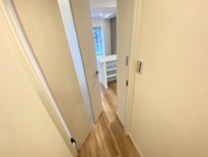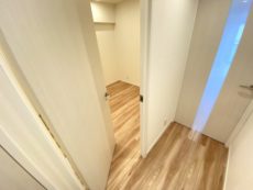 廊下をさらに奥へ。左右にトイレ、洋室、LDKの扉があり、正面の白い扉は収納になっています。