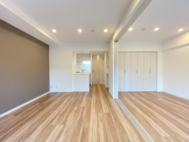 こちらは約10.5帖のリビング・ダイニング・キッチン+約6帖の洋室。仕切りの扉を開け、二部屋をつなげた様子です。約16.5帖の大きなお部屋の出来上がり!お客様が多い時に一時的に、部屋数に余裕があるので常時、など状況やライフスタイルによって様々な使い方が出来ますね。バルコニーに面したワイドスパンのお部屋になります。