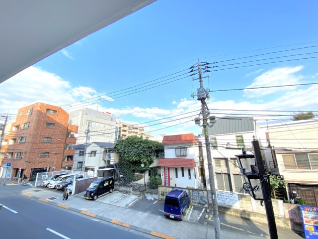 バルコニーの外に建つ建物は2~3階建てが中心。2階にしては開放的な眺めになっています。前を走る茶沢通りはそれ程通行量も多くなく、ペアガラスのおかげもあって室内は静かでしたよ。