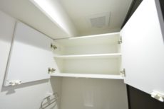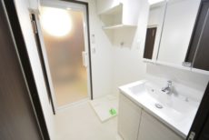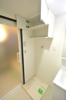 こちらは洗面室。洗面台の他に浴室、洗濯機スペース、トイレがまとまっていて、脱衣所も兼ねています。脱いですぐ洗濯出来れば効率的ですよね。洗濯機スペースには吊戸棚も付いているので、洗剤などはこちらに置いておけますよ。