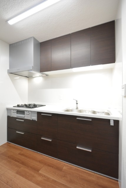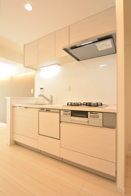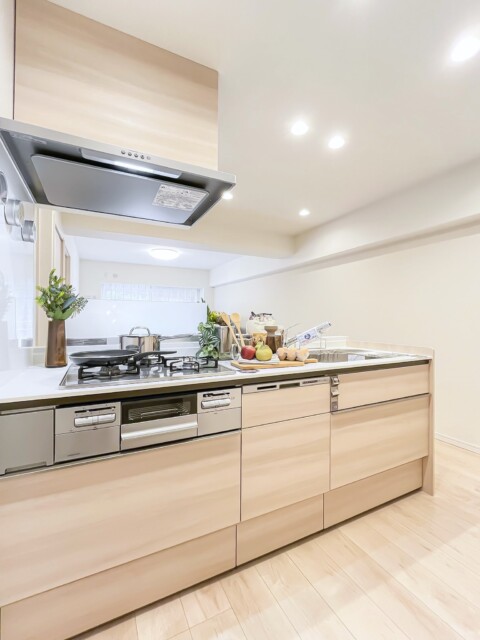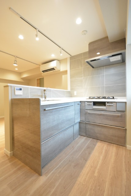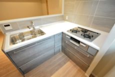 調理台はL字型。あまり動かなくてもいろんな所に手の届く、効率の良い形なんですよね。木目パネルが使用されていてお部屋の雰囲気にピッタリです。
