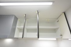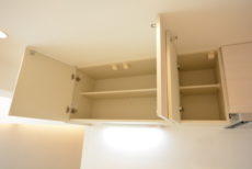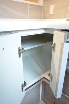 コーナー部分は扉が広く開くようになっているものの、多少出し入れしづらいのは否めません。容量はあるので、あまり使わない物を入ておくのが良さそうです。作業スペースがとりやすいのもL字型のいいところですね。