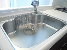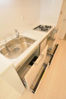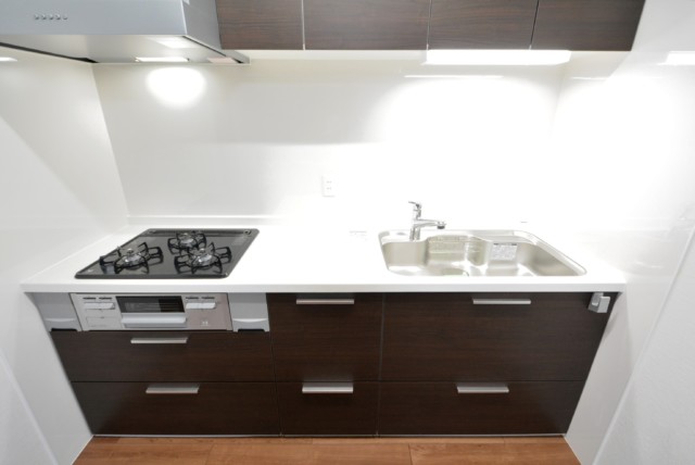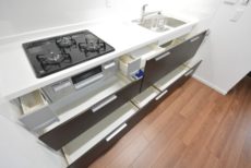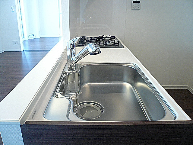 LDKへ戻りまして~クリナップ製システムキッチンです。トップは人造大理石、お手入れもしやすくキレイを心掛けたいですね。大きなシンクではスムーズに食器洗いもできそうです。3口コンロでは、炒め物しながら煮物もできお料理が手際よくこなせそうです。下部にあるスライド式収納は奥まで見やすく整理整頓がしやすいですね。