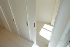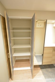 収納棚と姿見付きシューズボックスが並んでいます。収納棚は奥行きがあって、棚も可動式なので結構大きな物も入りそう。シューズボックスにはカウンターも作られていて、インテリアを楽しめるようになっています。「玄関は家の顏」って言いますから物置にならないように気を付けましょう(笑)