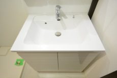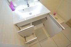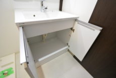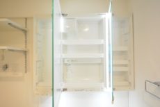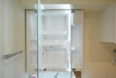 収納は洗面台下と三面鏡裏のキャビネット。細々した物が多くなりがちな洗面廻りには便利な収納です。