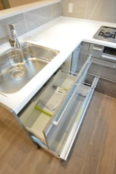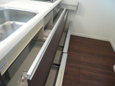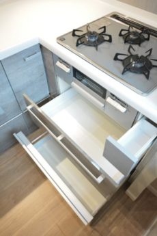 調理台下はずらりとスライドキャビネットが並んでいます。引き出しタイプは出し入れがしやすく、大きな鍋などでも楽に出し入れ可能ですよ。
