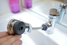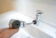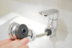 水栓はハンドシャワータイプ。広めの洗面ボウルなので寝ぐせくらいは直せそう。