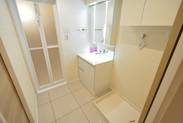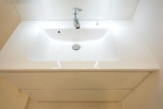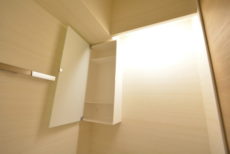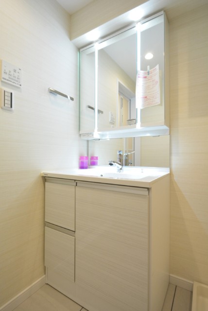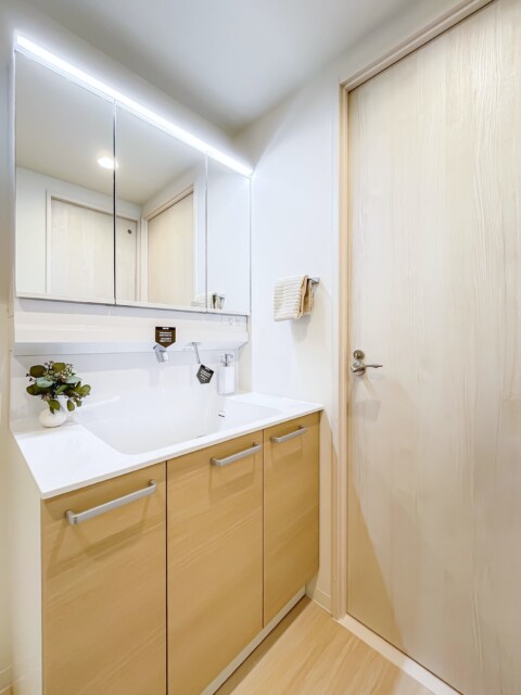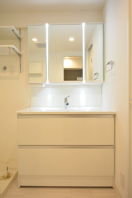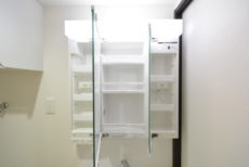 洗面台は三面鏡付き。鏡の間の照明で鏡を見る時に影になったりする事もありません。