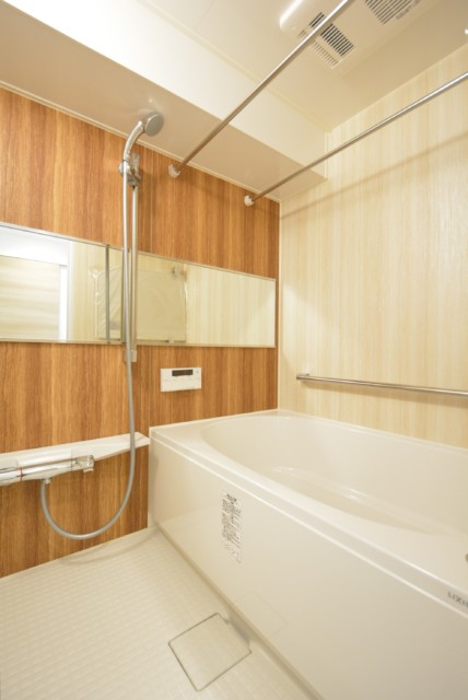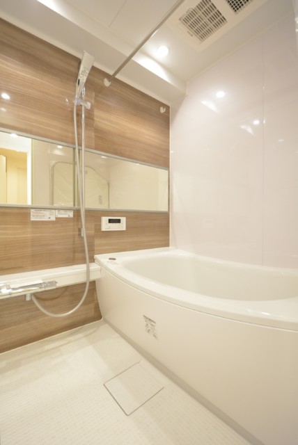 浴室はブラウンのアクセントパネルを使った落ち着いた雰囲気。リラックスしたいバスタイムにはピッタリです。