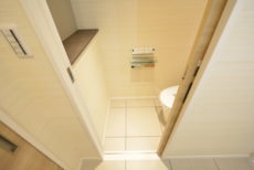 トイレはゆったりサイズで膝が当たる心配もありません。正面にはニッチカウンターも設置されています。