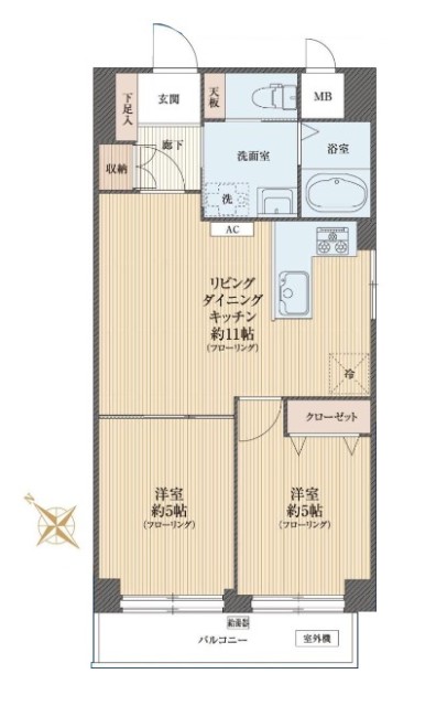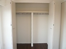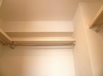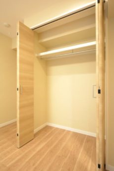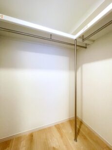 LDK右手にある2面採光のお部屋洋室5.4帖、2つのバルコニーに面しています。大きなクローゼットにはポールハンガーもあり、ワンピースにコートにと仕舞えそうです。