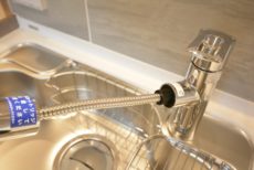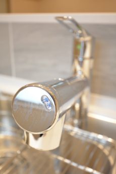 水栓は浄水機能付きシャワー水栓。気軽に美味しいお水を使えます。ヘッドが伸びるのでシンクを流したりにも便利ですよ。