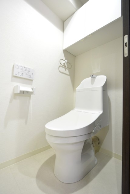 INAX製のシャワートイレやトイレットペーパーなどの収納に便利な吊戸棚も付いています。吊戸棚も縦型だと物が取りやすくていいですよね。高い位置にあると奥の物を取る時などに足がつりそうになります^^;)
