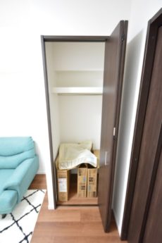 引き戸になっている扉をあけるとゴルフバックもらくらく置けてしまうぐらいのゆとりある広さのクローゼット。収納ケースなどをうまく活用すればより収納できそうです!