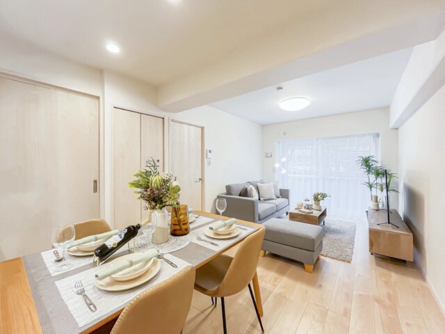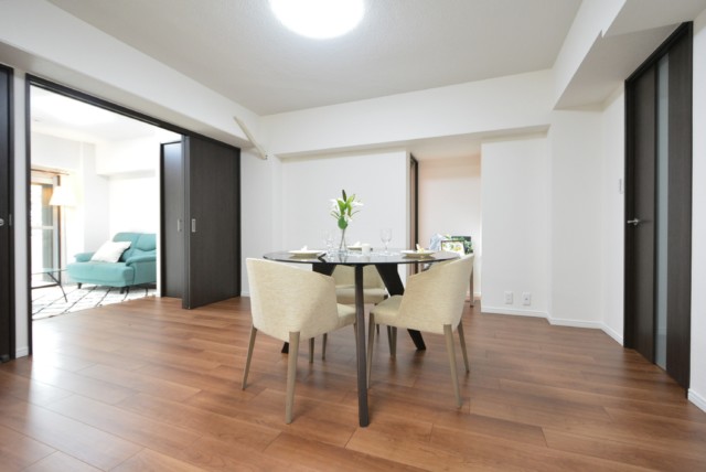 こちらは約11帖のリビング・ダイニング・キッチン+約5帖の洋室。仕切りの扉を開けて二部屋をつなげた様子です。ライフスタイルや状況に応じて使い分けが出来るのはいいですよね。玄関と同じナチュラルで落ち着いた雰囲気です。