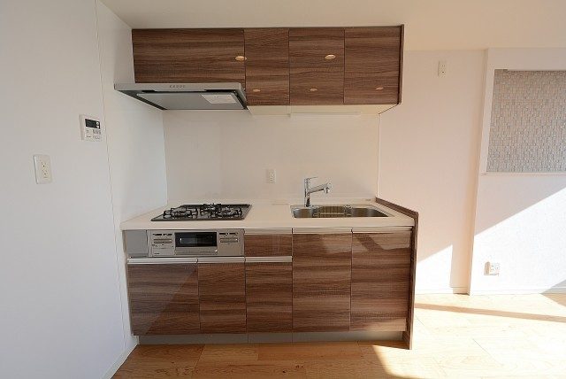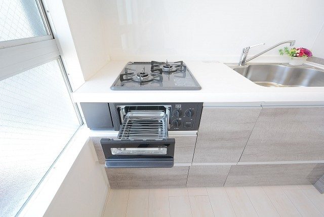 コンロは3口、グリルあり、浄水器内蔵シャワー水栓と設備も整っています。