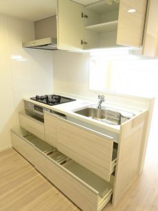 カウンター下の収納は引き出しタイプになっていますね。奥まで無駄なく使うことができますし、取り出しも上から楽にできるので主婦の方にも好評ですよ!!